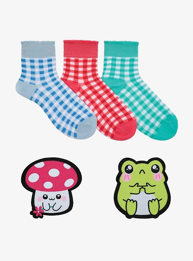 Gingham Quarter 3-Pair Crew Socks & 2 Patches Pack