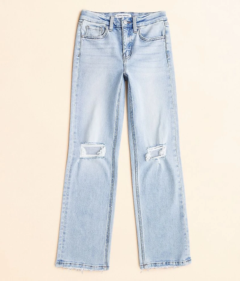High rise zip fly stretch jean Inseam measures 24" on size 10 and will grade accordingly to size Relaxed through the hip and thigh Adjustable waistband 17" bottom opening Snap button closure in sizes 5-8 Regular button closure in sizes 10-16 Destruction details