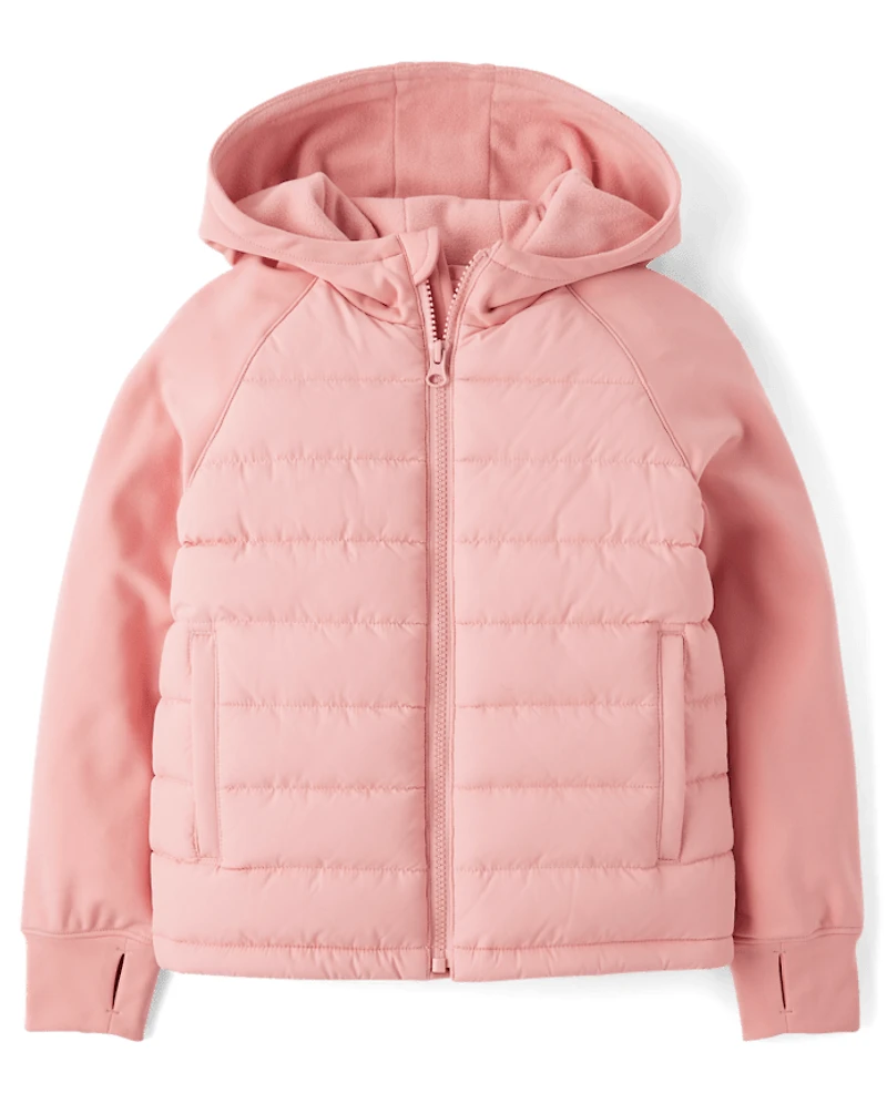 FABRICATION: 100% nylon front & back body for Pink Kiss style, 100% nylon front & back body for Dusky Blue style, 82% polyester/18% spandex interlock hood, sleeves, zipper guard & pockets, 76% polyester/24% recycled polyester microfleece body & hood lining, 100% recycled polyester fill, imported