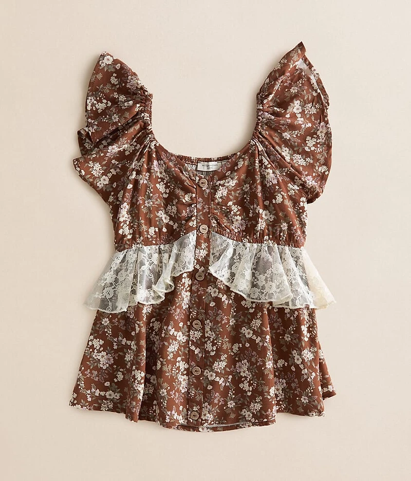 Printed faux button down elasticized top Flutter sleeves Smocked back Body length 19" on size medium