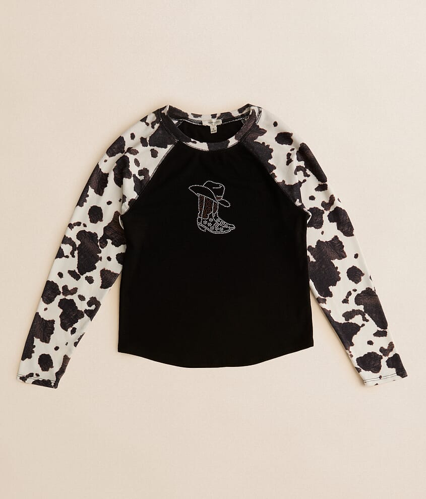 Graphic top Brushed cow print raglan sleeves Body length 19 3/4" on size medium