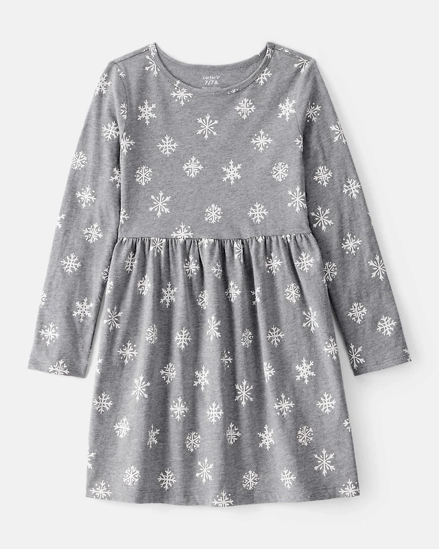 Girls Snowflake Print Cotton Long-Sleeve Dress - Grey