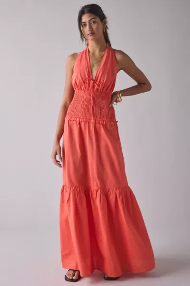 Glamorous Coral Plunge Halter Drop Waist Tiered Maxi Dress