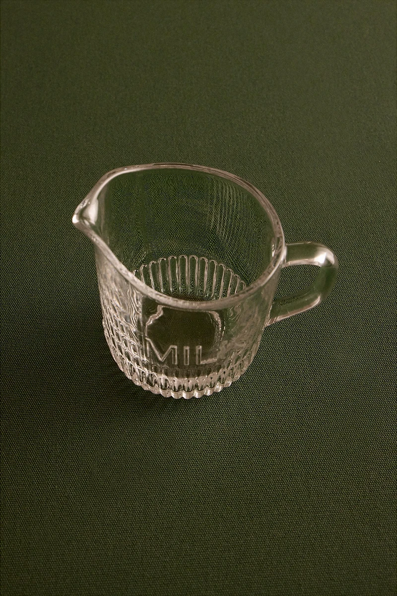 Milk pitcher made of glass, with a wide design and stripes at the base.