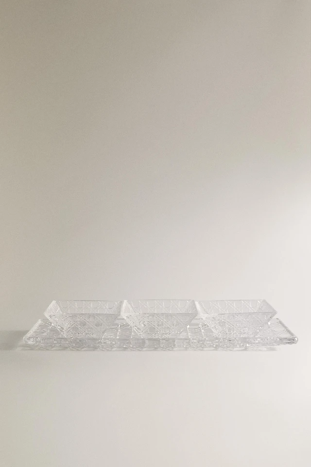 GLASS SERVING DISH WITH BOWLS AND A RAISED DESIGN