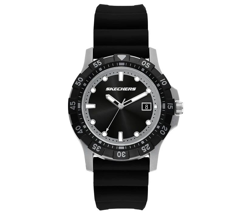 Tell time in sporty style with Skechers Glen Oaks Watch. This analog wristwatch features a round 42mm case with a rotating sport bezel, a black sunray dial with white accents, and an adjustable silicone strap for all-day comfort. The perfect accessory for all your adventures.