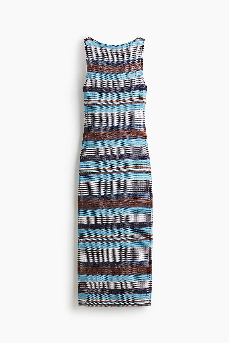 Long, slim-fit sleeveless dress in a soft open knit with glittery thread. Delicate boat neck and a straight hem.