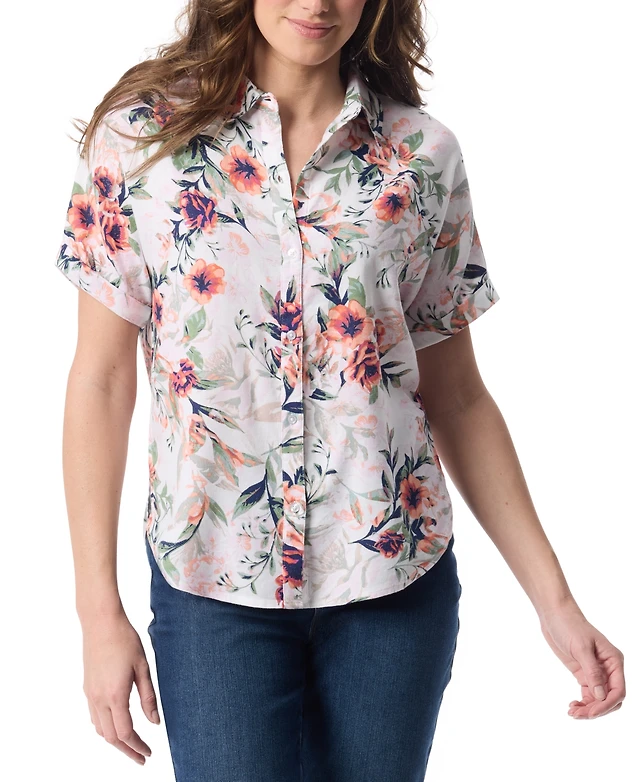 Gloria Vanderbilt Women's Daisy Printed Short-Sleeve Shirt - Multi White