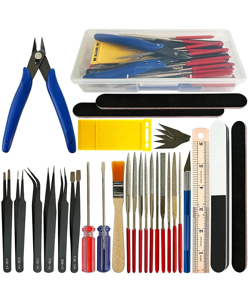 This model tool set includes 4 double-sided polished bars, 1 double-sided steel ruler with Cm/Inch markings, 10 metal files, 6 tweezers, 2 screwdrivers (flat-blade and Phillips), 1 model separator, 1 brush, 1 craft knife with 5 extra blades, and 1 side plier with blue rubber handle, totaling 32 pieces in a plastic storage box. Made of stainless steel, these tools feature sharp sprue cutters, precise tweezers for detailed work, and quality files with appropriate grit for model finishing. The lightweight, portable design makes them ideal for building dollhouses, miniature structures, car models, and model railroads. Suitable for hobby starters and experienced modelers needing replacement tools. Not recommended for users under 14 due to sharp objects. Handle blades and edges with care.