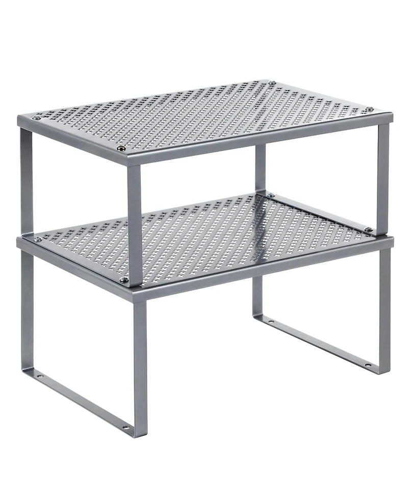 Maximize vertical space with this pair of stackable steel shelves. Perforated sides keep items visible and ventilated while the compact footprint fits inside most cabinets or on counters. Each tier supports 22 lb, so coffee makers, pans or canned goods stay secure. Nest, separate or stack the two sizes to create custom levels and double cupboard capacity. Wipe-clean powder-coated finish resists rust and daily wear. Set includes one large shelf and one small shelf, ready to use with no tools required. weight: 2.6 pounds. 9.2"D x 12.8"W x 6.0"H