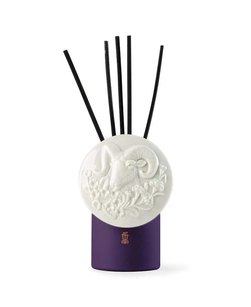 Each one of the twelve animals of the Chinese zodiac is represented in a collection of candles and diffusers. This diffuser is dedicated to the goat, minutely etched by hand on the white glazed porcelain lid.