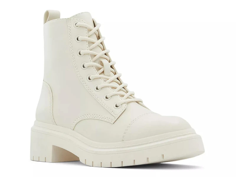 Boost your street look with the Goer Combat boot from Aldo. This water-resistant boot is crafted from vegan faux-leather with side zipper, lace-up closure and chunky rubber lug sole.