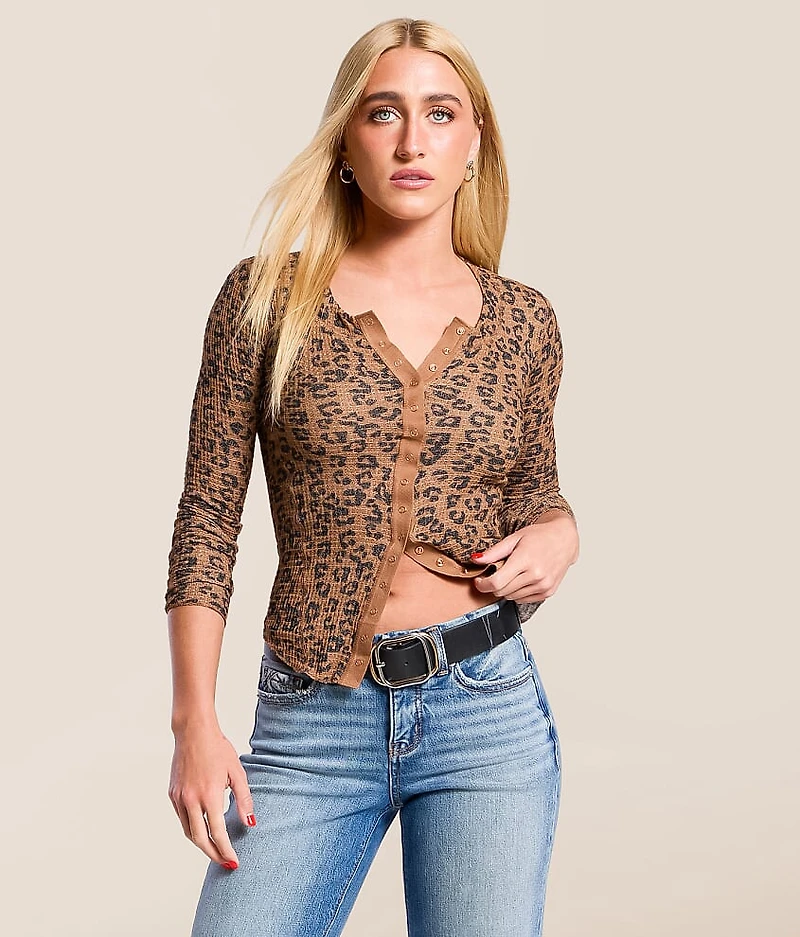 Printed waffle knit snap down fitted top Bust measures 26" on size small Body length 25 1/2" on size small