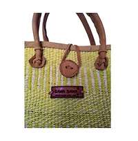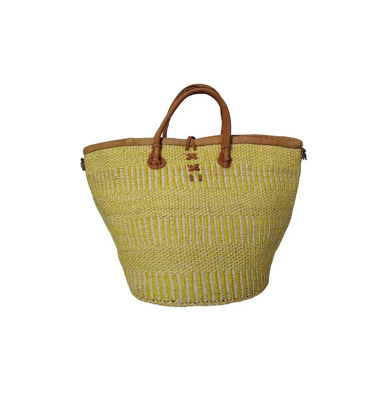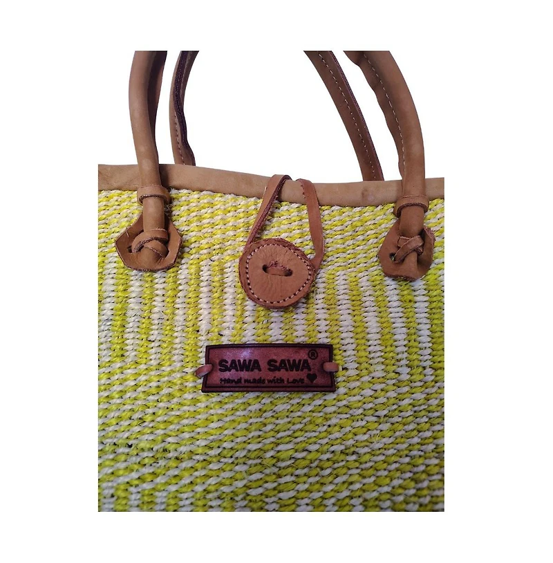 Bring sunshine wherever you go with the Sawa Sawa ""Golden Glow Warmth"" Basket, a joyful tote that celebrates life, growth, and radiant energy. Handwoven in rural Kenya by empowered women artisans, this sun-drenched piece features golden yellow and natural white sisal, symbolizing warmth, renewal, and abundance. Natural full-grain leather handles and trim add durability and elegance, while the structured silhouette ensures it s as functional as it is beautiful. Perfect for markets, spring getaways, Easter or Mother s Day gifting, and everyday adventures, it s a bright reminder of positivity and purpose. Each basket is sustainably crafted from hand-dyed sisal and leather, fair trade, and plastic-free. More than a bag, it s a piece of the sun-woven with love and designed to empower communities across Kenya.