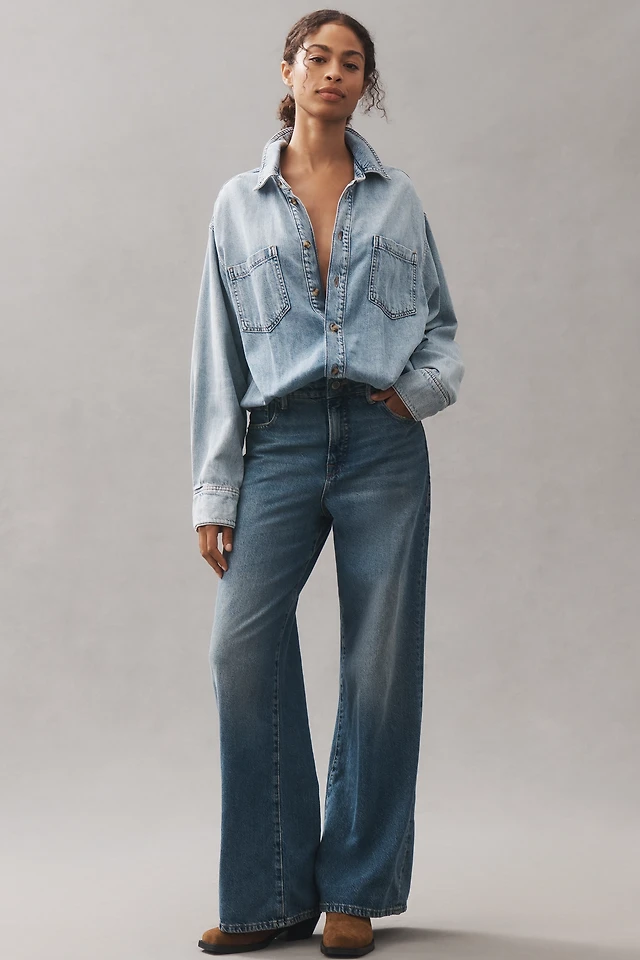 Good American Women's Denim Long Sleeve Shirt Jumpsuit, Regular and Plus