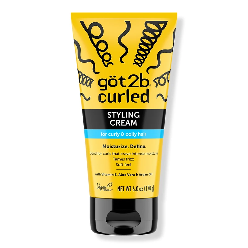 CURLED STYLING CREAM 6.0OZ. Benefits: CURL DEFINITION: got2b Curled Styling Cream provides controllable definition to style and shape curls. MOISTURE LOCK: got2b Curled Styling Cream boosts hair hydration and gives 72-hour moisture for healthy looking curls that last all day. BREAKAGE RESITANCE: got2b Curled Styling Cream makes hair 4x more resistant to breakage* *on damaged vs. untreated hair. FRIZZ CONTROL: got2b Curled Styling Cream reduces frizz for 72-hours* *in high humidity conditions vs. untreated hair. NO CRUNCH FEEL: got2b Curled Styling Cream for healthy looking defined curls without the crunch leaving a soft feel. Key Ingredients: Vegan formula* contains aloe vera and vitamin E. *Free of animal derived ingredients. :