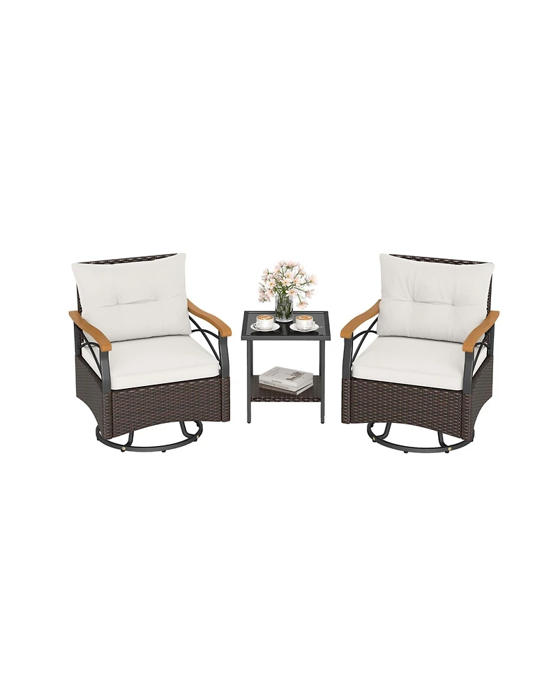 Gouun 3-Piece Outdoor Swivel Wicker Chair Set with Tempered Glass Side Table