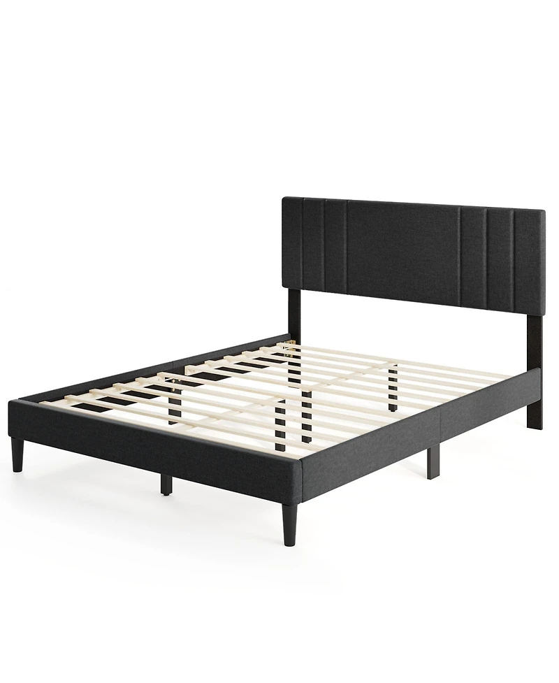 Vertical channel tufting lends a sleek, contemporary rhythm to this queen size bed frame, where clean parallel lines run from top to bottom across a padded headboard wrapped in soft faux linen fabric. High-density sponge provides cushioned comfort for leaning back in bed, while twelve plywood slats and multiple support legs form a stable platform rated at 800 lbs that requires no box spring.