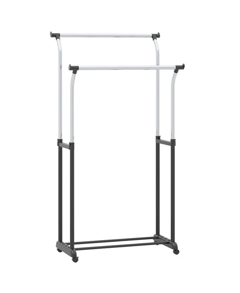 Rising from 42 to 69 in with a simple height adjustment, this double rod rolling garment rack adapts to closets, laundry rooms, and retail displays. Curved rods with 18 in spacing prevent garment wrinkles, while side rods and bottom bars expand hanging and storage capacity. Four smooth-rolling casters with two locking wheels enable effortless repositioning, and built-in safety locks keep clothes secure during transport across rooms.