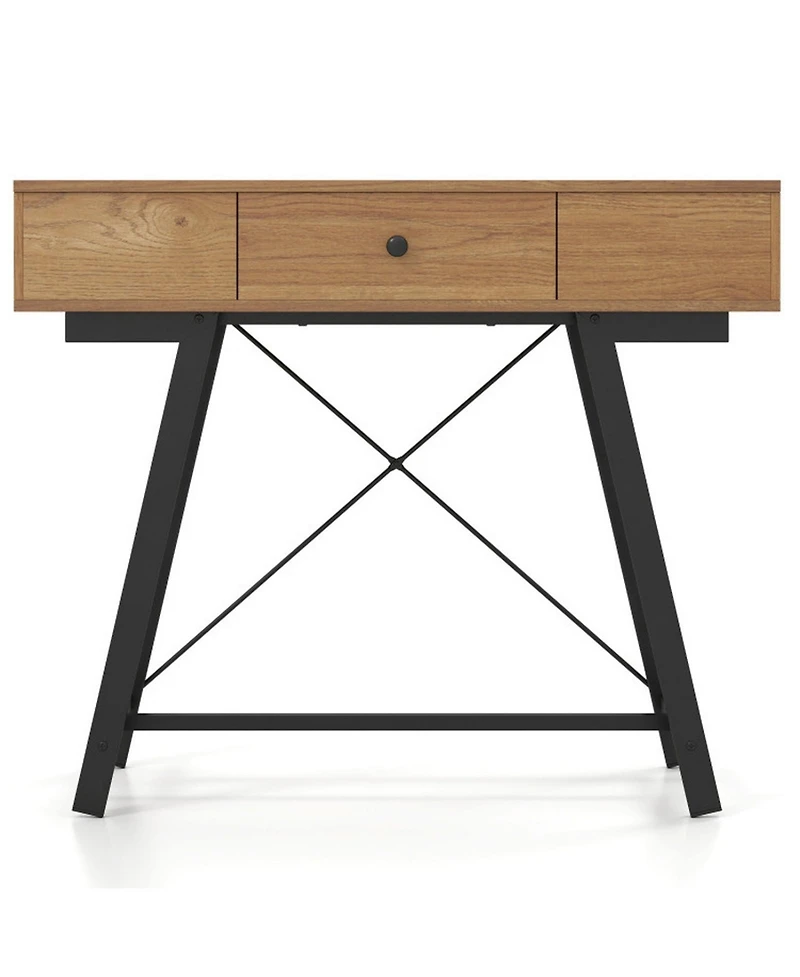 Industrial-chic styling meets everyday practicality in this flip top mirror vanity desk supported by a heavy-duty metal frame with X-shaped reinforcement bars. Gas struts lift the mirror panel smoothly to reveal a clear 23.5 in x 14 in reflection, then close for a clean desk surface. Six internal compartments and a center drawer keep items organized, while built-in power outlets with Usb and Type-c ports handle device charging. A cable management hole maintains a tidy workspace.
