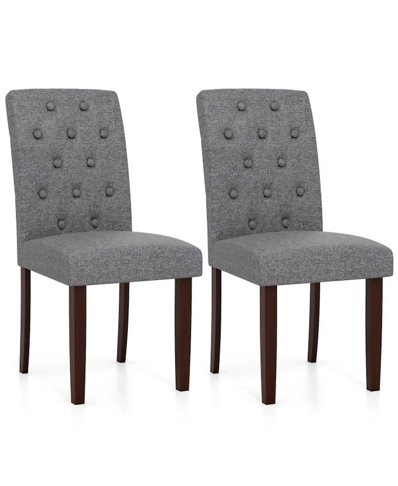 Add a tailored accent to your dining table with this set of two button-tufted fabric chairs featuring a high curved backrest that wraps around the shoulders. Each chair measures 18 by 24 by 37 inches and houses a spring-supported sponge cushion in the 18 by 17.5 inch seat for resilient comfort that bounces back after every meal. The rubber wood and Mdf frame carries up to 330 pounds, and the polyester cover in gray pairs effortlessly with warm brown wood legs.