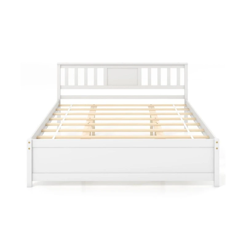 Clean farmhouse lines and a bright white finish define this queen size wooden platform bed, which pairs a simple yet elegant headboard with a solid pine wood frame and plywood slat support system. Eight evenly spaced slats distribute weight up to 440 lbs without the need for a box spring, while the 12-inch floor clearance opens up convenient under-bed storage for bins, shoes, and seasonal items. The 16-inch footboard adds structural rigidity and a finished look to the bed profile.