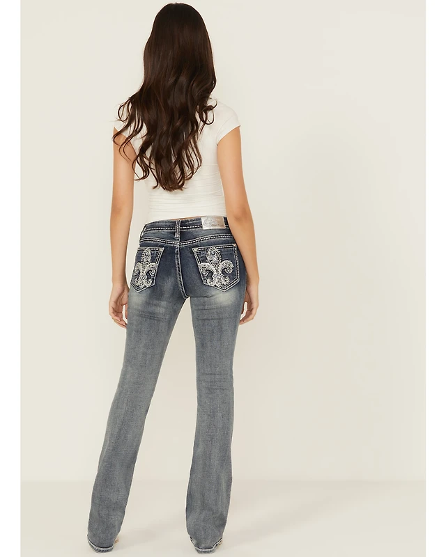 Grace LA Women's Fleur De Lis Pocket Mid Rise Bootcut Stretch Denim Jeans