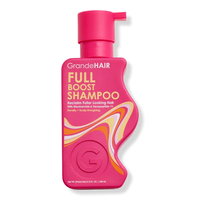 GRANDEHAIR FULL BOOST SHAMPOO 8.0OZ. Benefits: Cleanses without weighing hair down for natural volume. Exfoliates & energizes scalp to support a healthy hair environment. Helps reduce hair fallout & product buildup. Suitable for color-treated or keratin-treated hair. Sulfate-free with rich, juicy lather. Uplifting, invigorating scent with subtle notes of violet, iris & sandalwood. Key Ingredients: Grande Scalp Complex (Niacinamide, Ginseng, Grapefruits, Beet Microgreens): A proprietary, nutrient-dense blend that specifically targets scalp support and exfoliation. Grande Hair Complex (Thiamin B1, Rice Protein, Nori Seaweed, Lotus Seed, Sunflower Microgreens): A proprietary, hair-loving blend that supports shine, moisturization and manageability. Hexapeptide-11: Helps encourage total hair health. Research Results: In a consumer study:. 91% saw boosted, fuller looking hair. 94% felt scalp was healthier. *Based on a consumer study with GrandeHAIR Full Boost Shampoo & Conditioner with 34 subjects. Results will vary..
