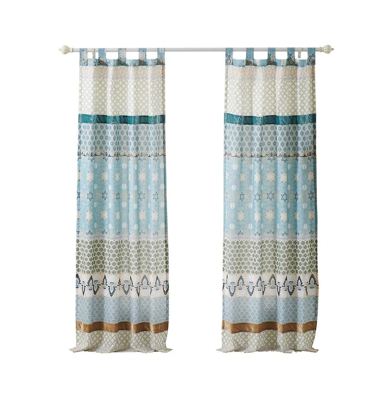 Introducing the Thalia Bohemian Panel Set – a vibrant addition to your windows! Rows of vivid geometric, foulard, and floral prints create distinctive styling. Crafted with multi-fabric construction and embellished with velvet bands, this panel pair features the latest fashion colors. The face is 95% cotton and 5% polyester, while the back (2-ply) is 100% cotton. Tab tops allow easy hanging on up to 3" rods. Each panel measures approximately 84" long x 42" wide, including the 3" tab top. Lined for privacy and sun protection, this 4-piece set includes two panels and two tiebacks. Machine washable and adorned with button embellishments, it adds charm and character to any space! Color: Blue.