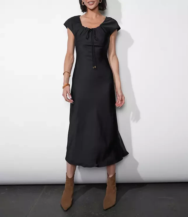 A timeless midi dress crafted with a subtle sheen, offering an effortlessly elegant silhouette. Designed with a softly ruched neckline and delicate tie detail that adds a feminine touch. The cap sleeves and bias - cut skirt create graceful movement, while the lightly flared hem enhances the drape. This versatile piece transitions seamlessly from day to evening. This item can only be exchanged or returned by mail., Imported:, Length: 48 3/4"from shoulder to hem Loft Greylin Inez Neck Drawstring Satin Midi Dress Size Small Black Women's by Loft Size Regular - S Black Women's A - line, Dresses Dressy