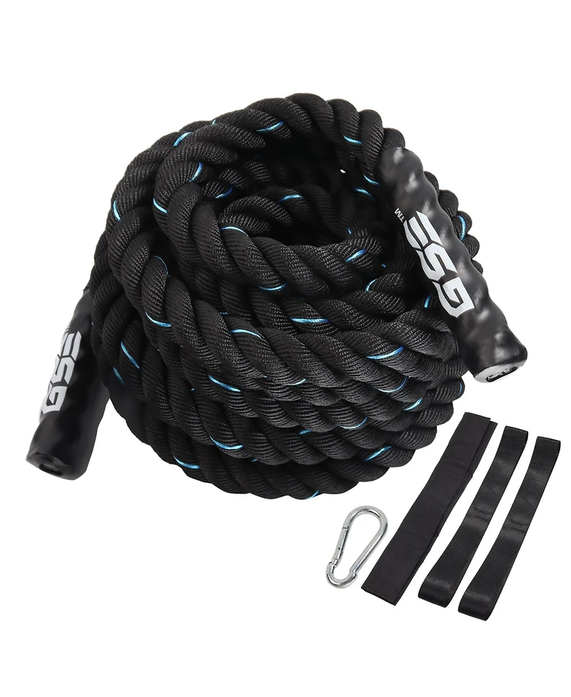 The gym rope is made from durable 100% polyester, 3-strand twisted structure. The battle rope offers the best grip and is extremely durable. Heat-shrunk vinyl sleeves cover the end of the rope. Use our extreme tensile strength reinforced nylon anchor straps and carabiner to secure your battle rope anywhere in seconds. Used as a physical exercise training rope, battle rope, fitness rope, and tug-of-war rope.