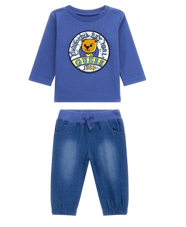 Guess Baby Boy Long Sleeve T-Shirt and Stretch Denim Bottom Set
