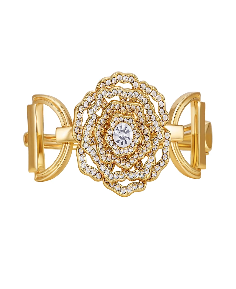 Create a stylish statement with this Guess cuff bracelet, showcasing layered petals and sparkling pave details for bold sophistication. Crafted in a polished gold-tone finish, it's a standout accessory that effortlessly elevates any outfit.