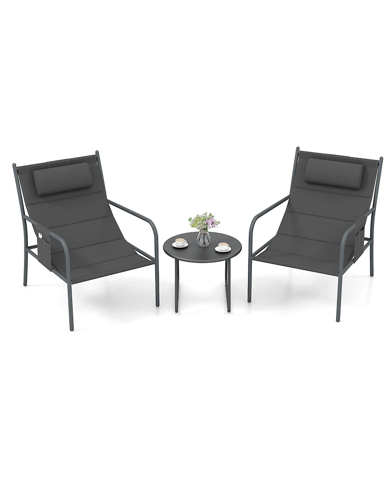 Revamp your patio with our stylish 3-piece bistro set, complete with 2 chairs and a table to create the ultimate outdoor retreat. Unwind in the embrace of our ergonomic chairs, each featuring supportive armrests, a removable head pillow, and a sling seat that intuitively follows your body's curves. For long-lasting comfort, the seats are cushioned with dense sponge and wrapped in skin-friendly fabric, keeping you comfortable and relaxed even during long hours of chatting or reading marathons. The set is further graced with a round coffee table, offering a practical storage for your refreshments and treats.Features:Ergonomic comfy seat design with long curved armrestsPremium material of patio chairs offers lasting qualitySeat filled with sponge for soft and comfortable recline