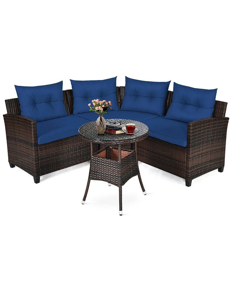 Gymax 4PCS Patio Furniture Set Outdoor Rattan Sectional Sofa Set w/ Navy Cushions