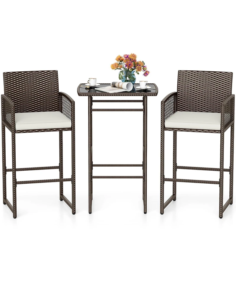 Gymax Set Of 3 Patio Bar Set Wicker Table & Armchairs w/ 2 Cushions & Glass Tabletop