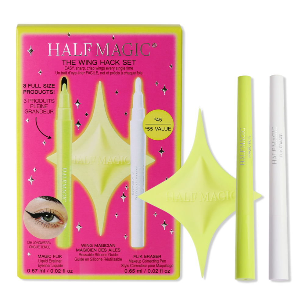 THE WING HACK SET. Includes: Magic Flik Liquid Eyeliner (0.02 oz). Wing Magician Reusable Silicone Guide (1 ct). Flik Eraser Makeup Correcting Pen (0.02 oz). Features: 12-hour transfer-proof + smudge-proof liner. First-of-its-kind reusable wing guide. Ultra-precise makeup correcting pen. :
