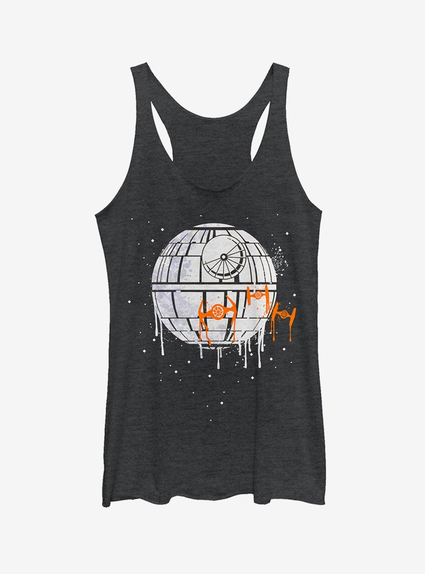 It's a full moon so all the goblins and ghouls will be out...oh wait, that's no moon! It's the Star Wars Halloween Death Star Drip Women's Racerback Tank Top. The Death Star is portrayed in orange with "Happy Halloween" above on this fun Star Wars tank top.