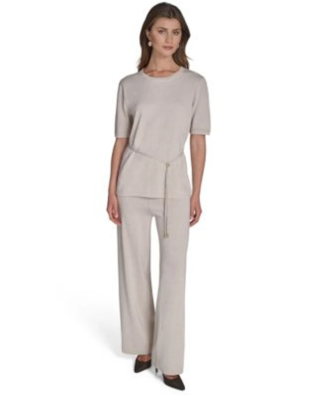 Halston Womens Metallic Tie Waist Round Neck Top High Rise Wide Leg Knit Pants
