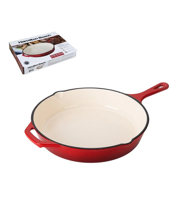 Hamilton Beach Enameled Cast Iron Fry Pan 12-Inch Red, Cream Enamel Coating, Skillet Pan for Stove Top and Oven