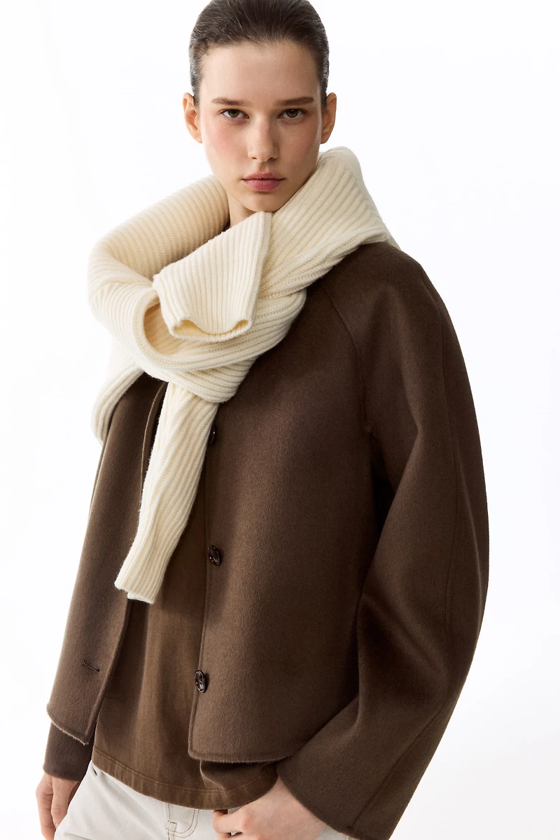 Short jacket in a felted wool blend. Ribbed stand-up collar, buttons at front, and discreet side pockets. Long raglan sleeves. Unlined.