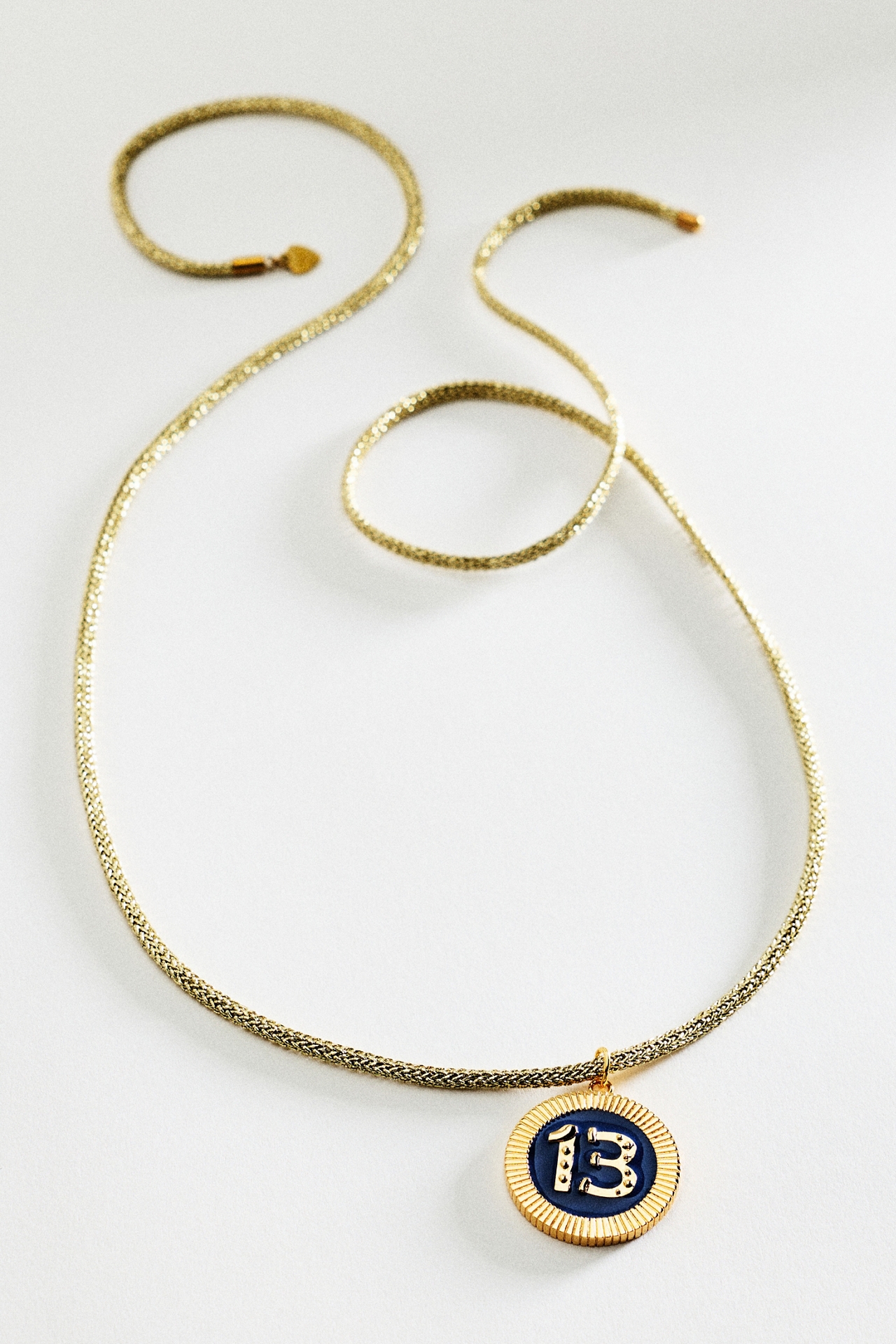 • gold-plated brass, enamel charm; cotton, gold-plated brass cord