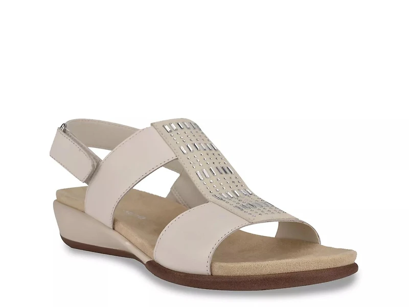 Add a touch of elegance to any look with the Hazel wedge sandal from Easy Spirit. This pair features a sparkling t-strap detail and secure hook and loop slingback strap for stylish comfort.