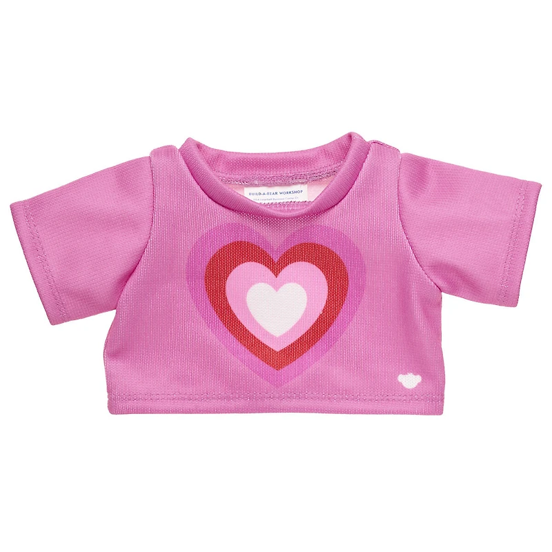 This cute pink sweater for stuffed animals features a colorful heart print in the middle.