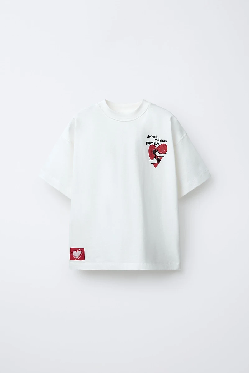 Round neck short sleeve T-shirt. Embroidered detail on chest, heart print on back, and label appliqué on hem.