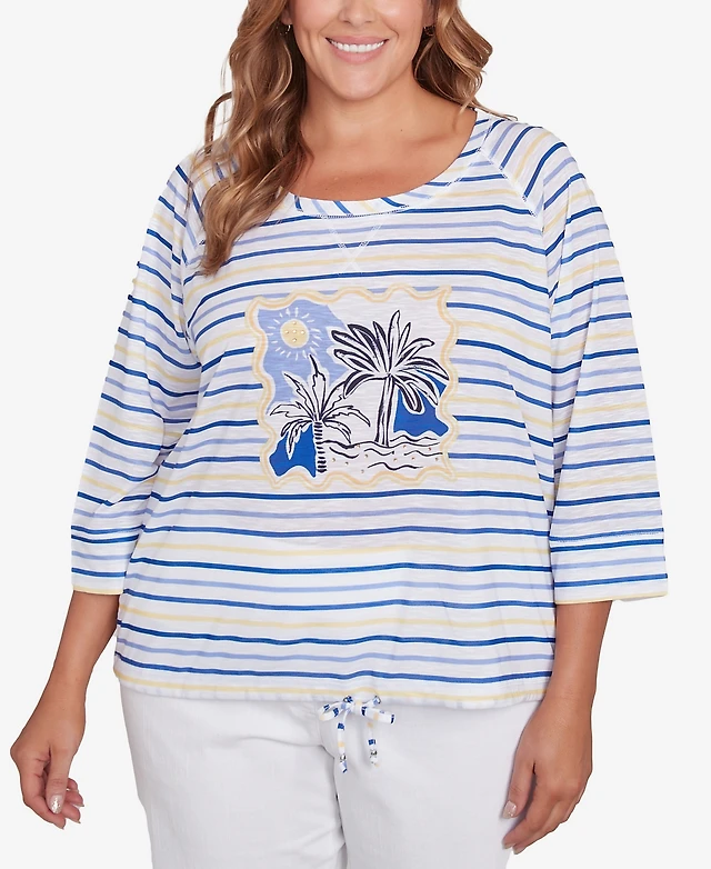 Hearts Of Palm Plus Making Waves Beach Scene Drawstring 3/4 Sleeve Top