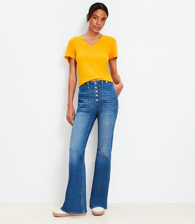 Frayed High Rise Slim Flare Jeans Classic Mid Wash