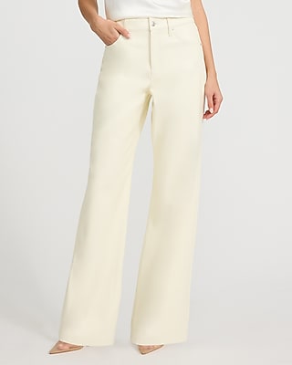 A smooth buttery faux leather pant in the perfect winter neutral color featuring a high rise waist, a classic wide leg shape, and five pocket styling.