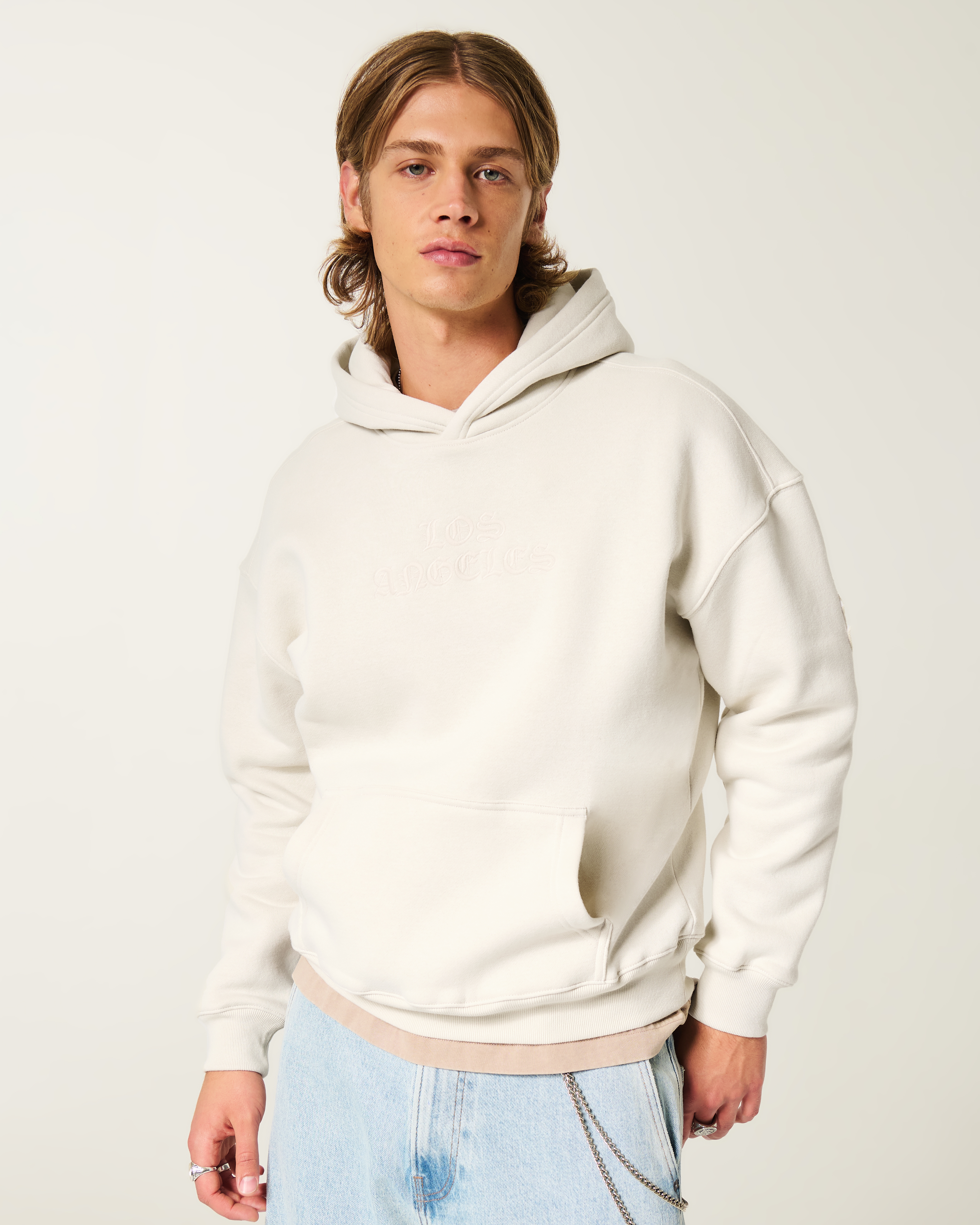 A hoodie in our signature soft fleece fabric featuring Los Angeles graphic embroidery at the front and California graphic applique across the back. Front pouch pocket, long sleeves, hood. Boxy Fit. Imported.