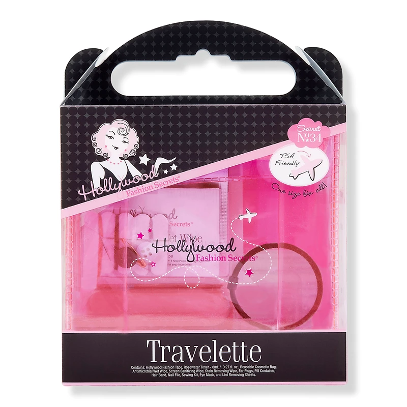 . Includes: Hollywood Fashion Secrets Fashion Tape (6 ct). Rosewater Hydrating Toner. Reusable Cosmetic Bag. Lint Removing Sheets (30 ct). Antimicrobial Wet Wipe. Screen Sanitizing Wipe. Stain Removing Wipe. Pair of Ear Plugs. Sleep Eye Mask. Pill Container. Sewing Kit. Hair Band. Nail File. : :